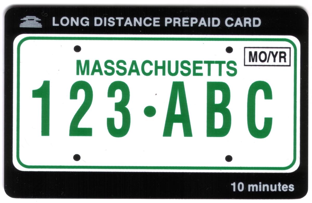 This collectible phone card features a green and white Massachusetts license plate design from the Northeastern United States. The plate displays the word "Massachusetts" in green lettering across the top, with the main portion of the plate in white background and green text. The design includes the classic layout and font style associated with Massachusetts automotive license plates.