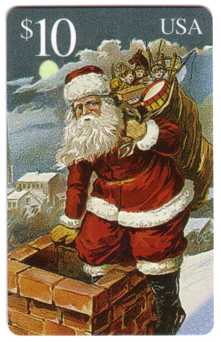 This collectible phone card features a festive Christmas theme, prominently displaying Santa Claus descending a chimney filled with a colorful assortment of wrapped toys, emphasizing the holiday spirit. The design includes a traditional red mailbox alongside a music drum, enhancing the seasonal imagery associated with Christmas and holiday celebrations. The vibrant colors and detailed artwork highlight the joyful mood of the holiday season.
