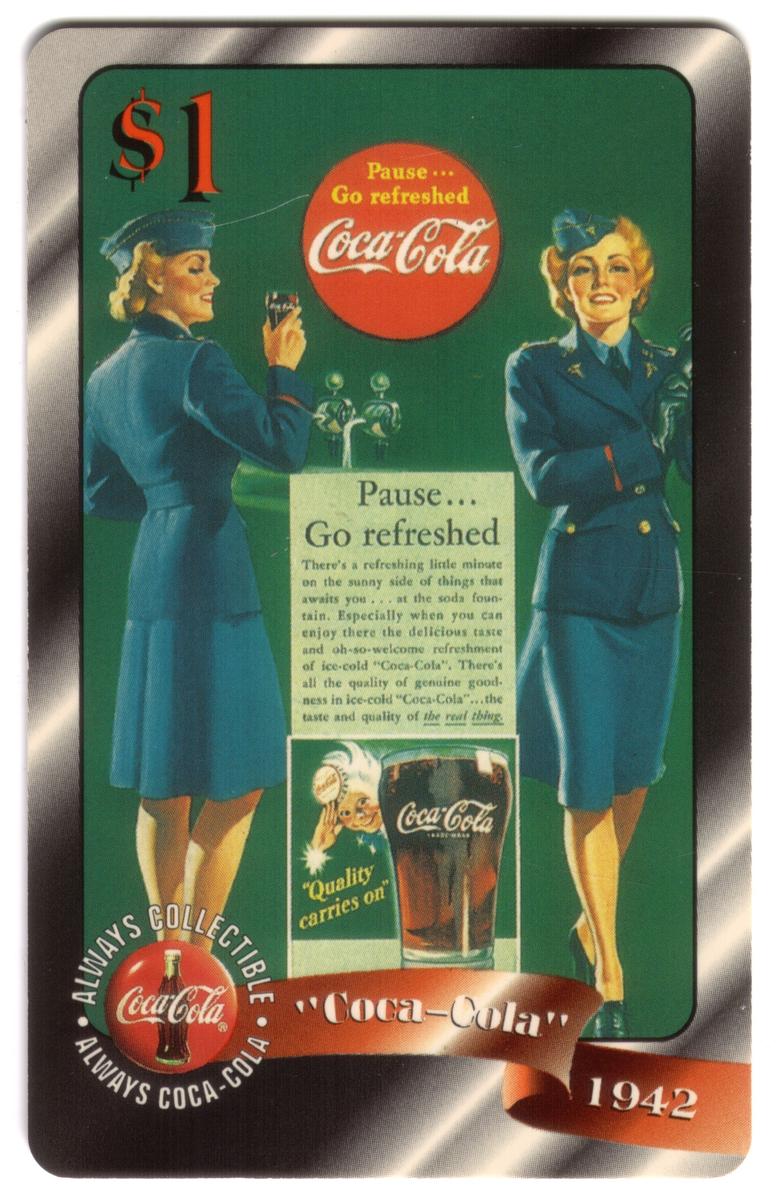 The card includes text identifying it as “WWII Woman ‘Pause’ (1942),” referring to the famous World War II Coca-Cola advertising campaign featuring women taking a break. This is card number 7 of a set of 48 cards released by The Score Board Inc. The denomination "$1" is printed clearly on the card, alongside the year “’96,” indicating a 1996 release commemorating the 1942 theme. The design integrates a clean white background behind the central image, with no additional imagery aside from the military woman and Coca-Cola branding.