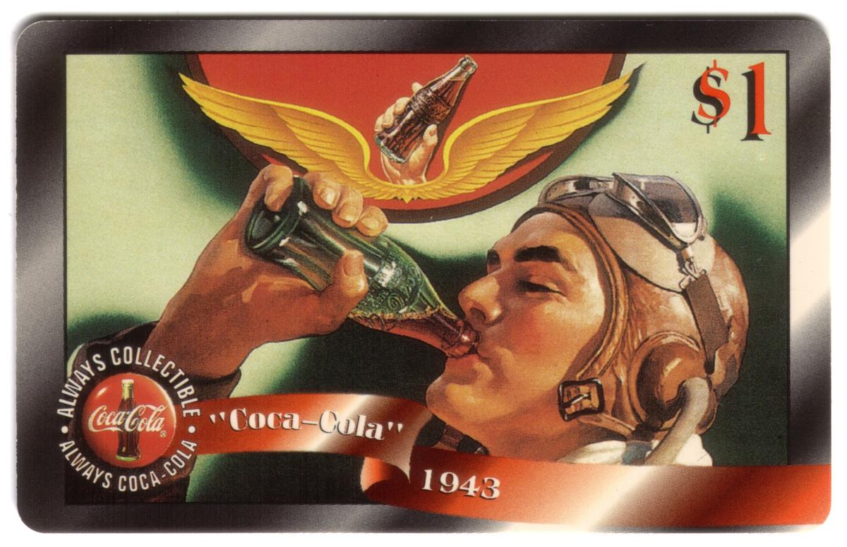 Text on the card identifies it as "Coca-Cola '96 $1. WWII Pilot (1943) Coke Card," connecting it to both the Coca-Cola brand and the wartime aviation subject. The combination of the Coca-Cola imagery and the historical military pilot creates a unique collectible that commemorates both the brand and an important era in history.