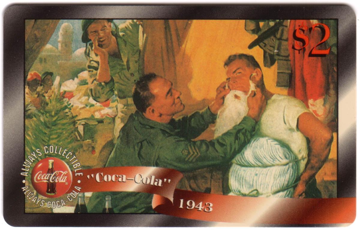 The design combines nostalgic holiday imagery with Coca-Cola branding, emphasizing the vintage Santa figure linked to wartime history through the makeup style. The card’s artwork reflects the mid-20th century period, capturing the spirit of Coca-Cola’s historic advertising campaigns.