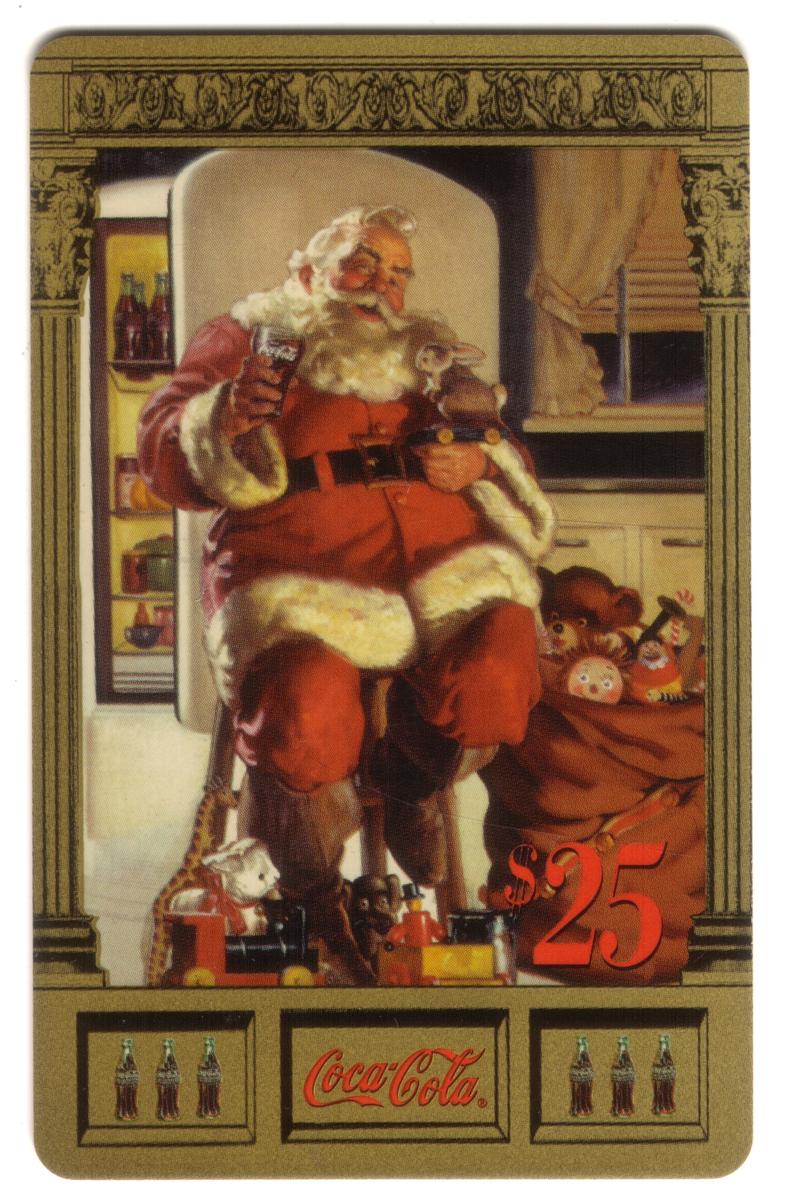 This collectible card features a classic Coca-Cola Christmas theme centered around Santa Claus. Santa is depicted wearing his traditional red suit with white fur trim, holding a bag full of colorful toys. Prominently displayed next to Santa are multiple Coca-Cola logos in their iconic red and white colors, emphasizing the brand’s strong association with the holiday season. The artwork shows Santa with a warm smile, capturing the festive spirit of Christmas.