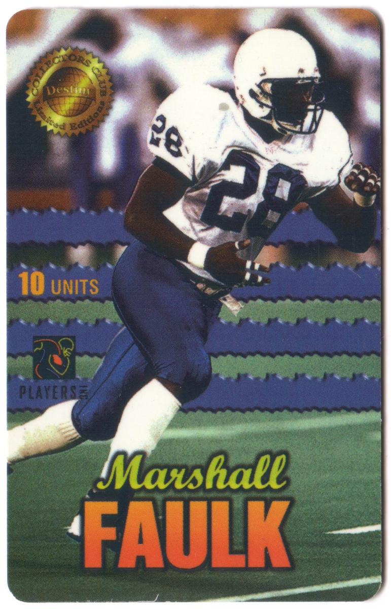 The card's design focuses on professional football elements, including the use of football imagery and text related to the sport. It bears the branding "Destiny Telecomm," associating it with a specific collectible card series or manufacturer. The color scheme and layout emphasize the football theme, with "Marvel Faulk rb 10u Men of Destiny" presented clearly on the front.