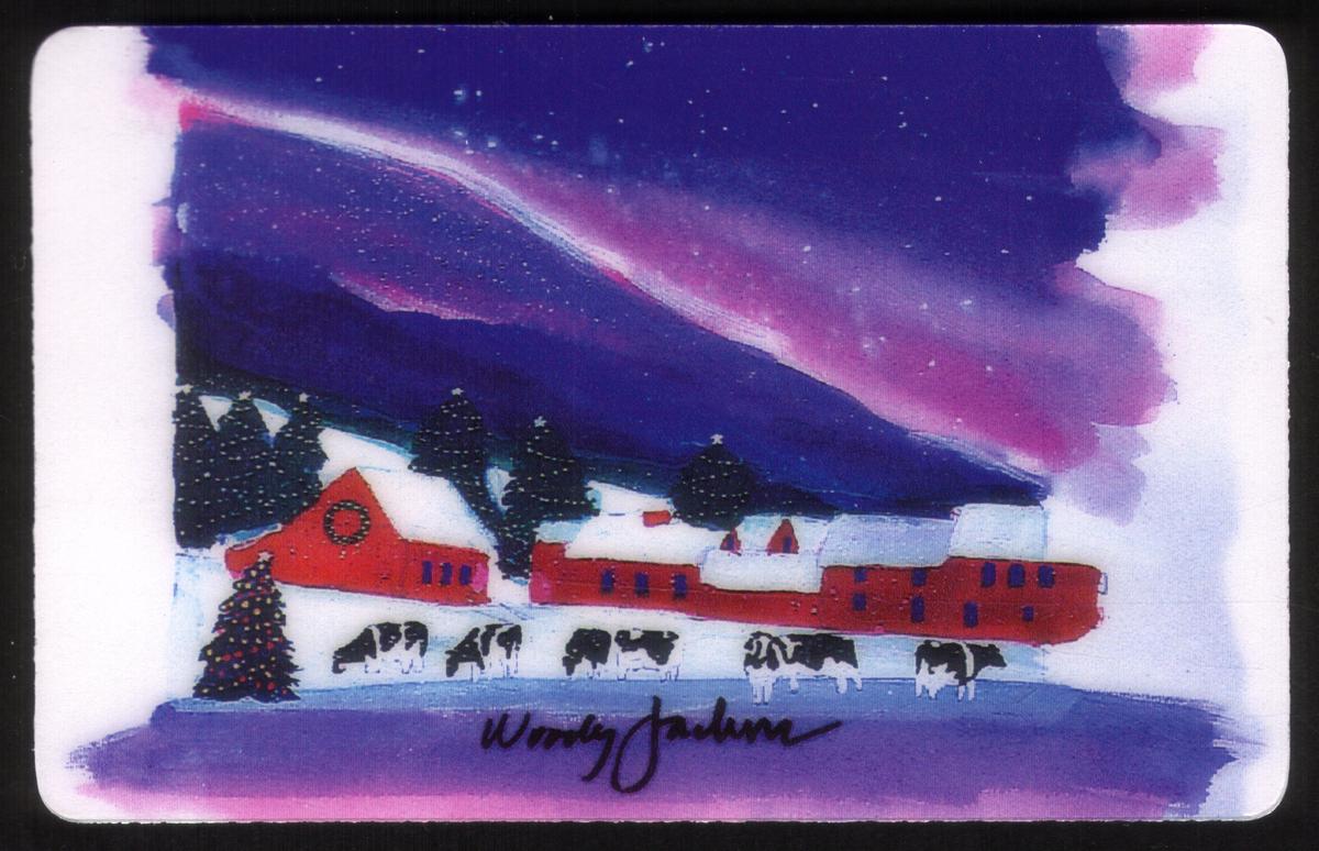 This collectible card features an artistic painting entitled "Northern Lights," created by Woody Jackson from Middlebury, Vermont, located in the Green Mountain State. The scene captures a snowy Christmas landscape with a group of cows gathered in the foreground, showcasing a wintry rural setting. The cows appear calm and are painted in a naturalistic style with individual markings visible. Snow blankets the ground and the surrounding environment, enhancing the peaceful and festive atmosphere of the painting.