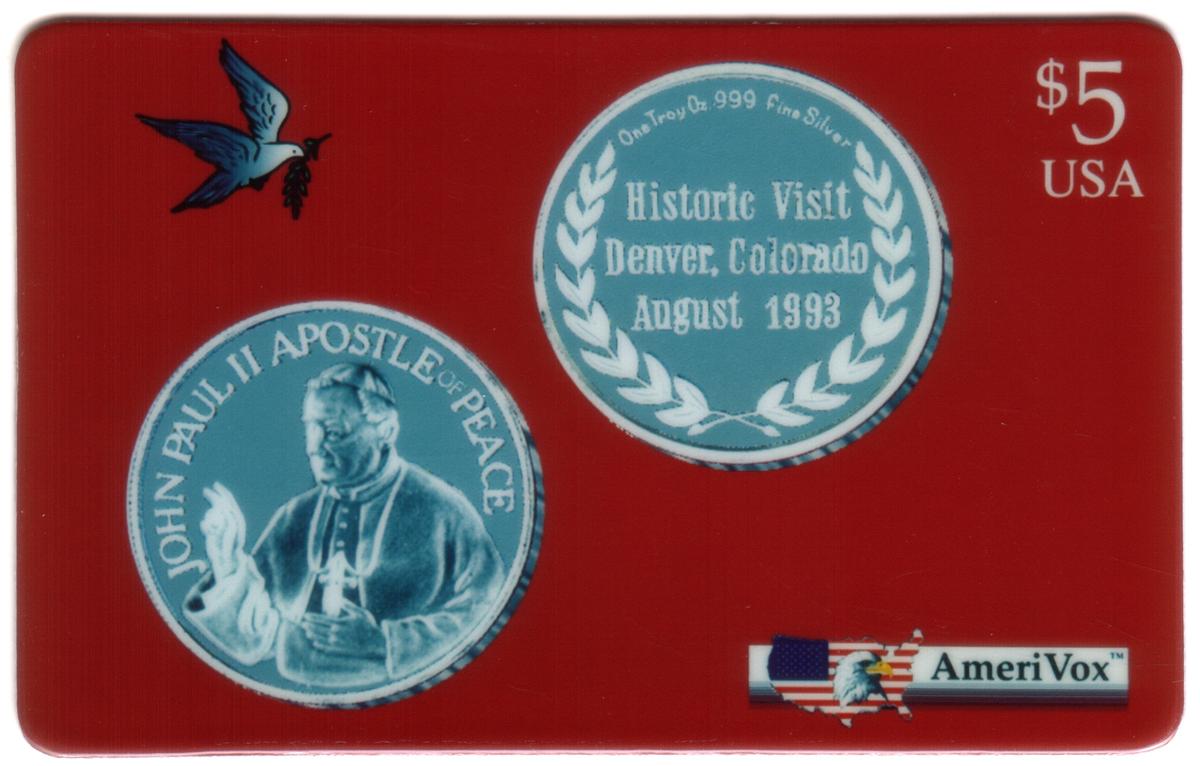 The background of the card is simple, focusing attention on the pope. In the upper left corner, the text reads “Pope John Paul II Historic Visit: Denver, Colorado Aug. 1993” in blue and yellow lettering. The bottom right corner includes the denomination "$5" in red and blue, paired with the word "Saint." The word "AmeriVox" appears near the bottom center of the card, identifying the issuing company.