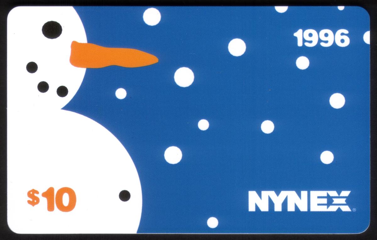 Overall, this collectible phone card captures the essence of the holiday season with its bright and cheerful snowmen imagery, clear denomination, and company identification. It represents a seasonal issue issued by NYNEX, celebrating Christmas and the winter holidays in 1996.