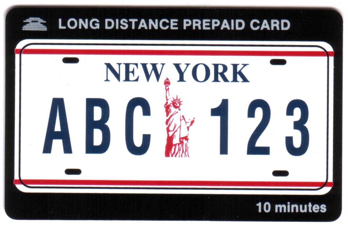 This collectible phone card features a New York license plate design with the letters "ABC" prominently displayed on it. The license plate is styled with red and white colors. Positioned beside the license plate is a vivid image of the Statue of Liberty, one of the most iconic American landmarks, symbolizing freedom and democracy. The Statue of Liberty is shown in detail, capturing its distinct greenish patina.
