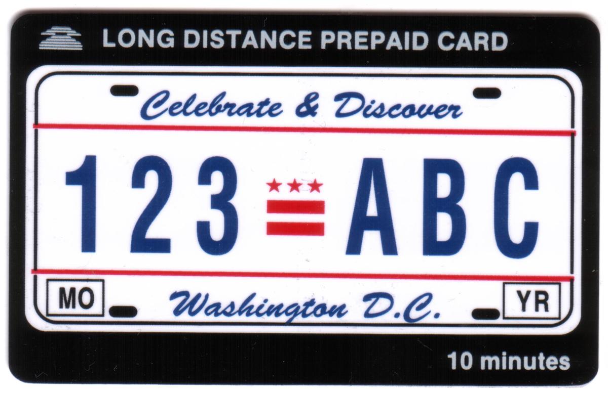 Overall, this phone card captures a blend of American culture, focusing on the capital city’s emblematic landmark and its automotive identifiers. The imagery and text clearly link it to Washington, D.C., providing a collectible item that celebrates both the city’s architectural heritage and its license plate design.