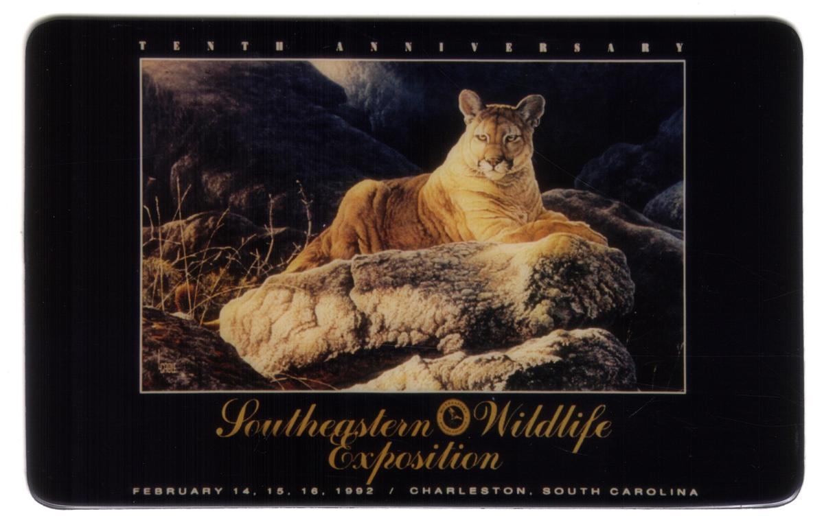 The card commemorates the 10th anniversary of the Southeastern Wildlife Expo and is issued by MT WorldCom. The front design effectively combines wildlife imagery with the theme of art and nature, emphasizing the significance of wild animals in their habitats. The text "Southeastern Wildlife Expo 10th Anniv. Commem." and "Mountain Lion" is clearly printed, underlining the event and the featured animal.