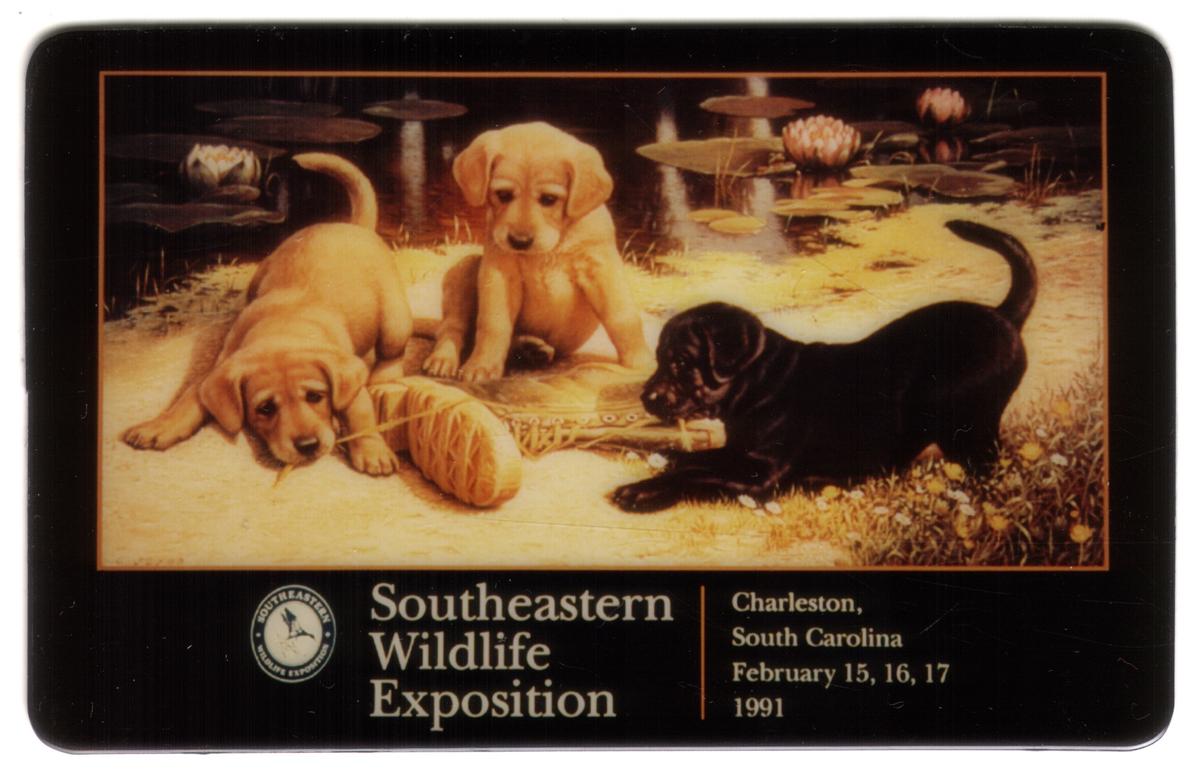 The card is titled "Puppies (Dogs) Playing: Southeastern Wildlife Expo Commemorative." It is associated with the Southeastern Wildlife Expo and is produced by MT WorldCom. The design includes references to Charleston, South Carolina, which is linked to the event. The card has a $25 denomination printed on the surface, indicating its value.