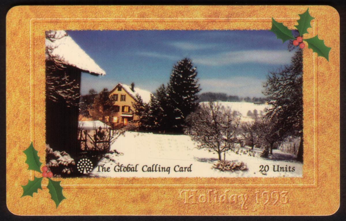 The card is from the 1993 Holiday series by AZA CommNET and is associated with Global Tel. Solutions. The card also includes the WorldCom logo, indicating the telecommunications provider linked to this collectible. The overall design captures the spirit of Christmas and the winter holidays, emphasizing traditional seasonal elements such as snow, trees, and holiday greenery.