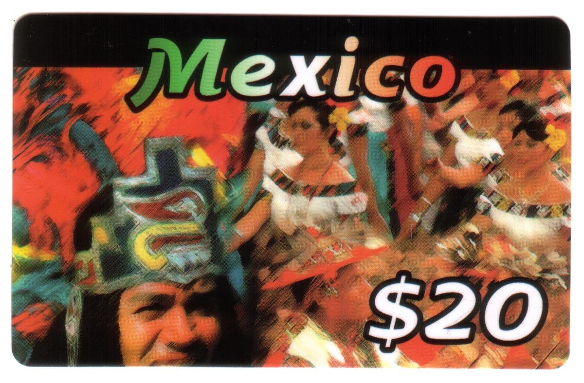 Text elements on the card include "MEXICO $20" in the top left corner, denoting the card’s country of issue and face value. Below the parade image, the card bears bilingual inscriptions in English and Spanish, highlighting "Sightseeing" and "WT Communication Svc." The overall design combines elements of celebration and cultural heritage, representing Mexico’s rich indigenous traditions through the parade imagery.