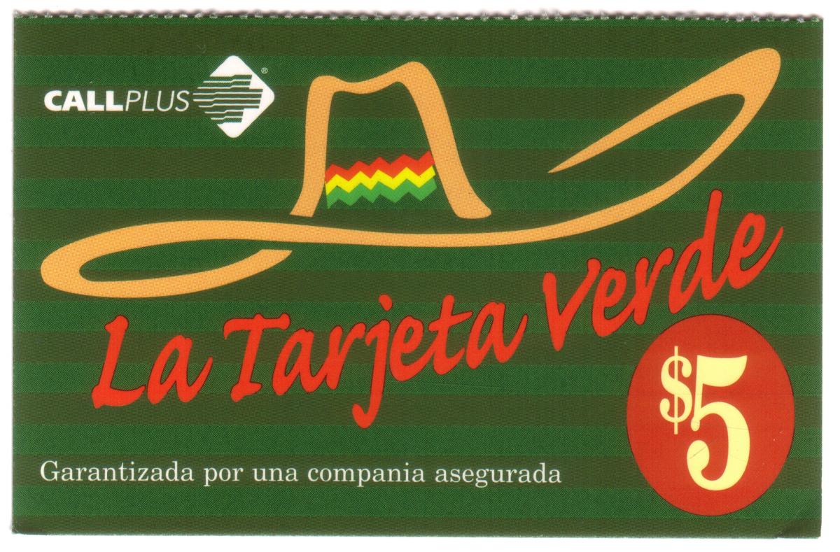 Overall, this card is a collectible item reflecting Mexican heritage through its use of cultural symbols like the sombrero and its green color theme. It is a $5 denomination card issued for telecommunication purposes by CallPlus and intended for consumers utilizing Spanish language services in Mexico.
