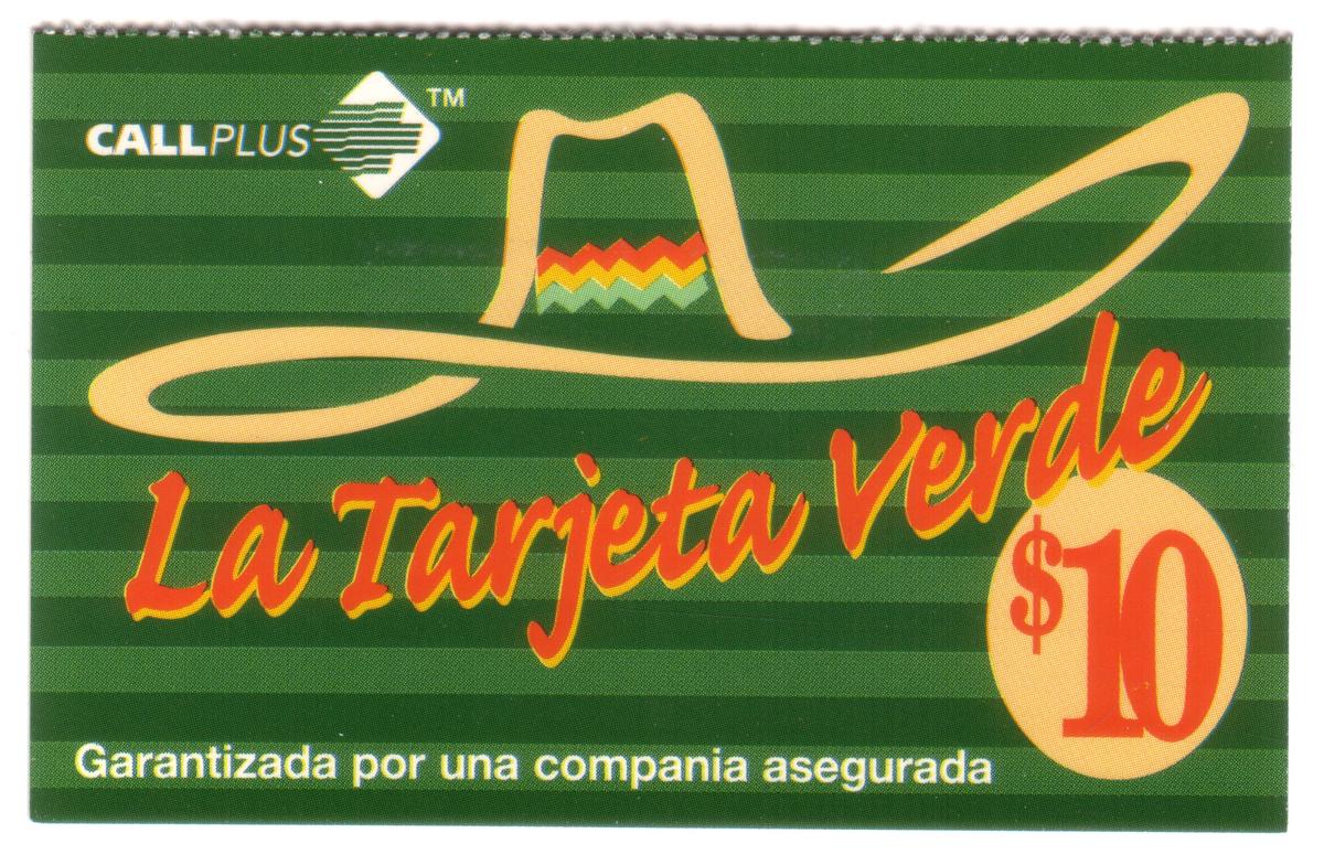 This collectible card is a $10 phone card from Mexico, featuring the name "La Tarjeta Verde" (The Green Card). The card prominently displays the image of a traditional Mexican sombrero, rendered in green tones consistent with the card’s name. The design includes the text "CallPlus" indicating the telephone service provider affiliated with this card. The card is in Spanish and uses the dollar sign ($) to denote its value as 10 Mexican pesos.
