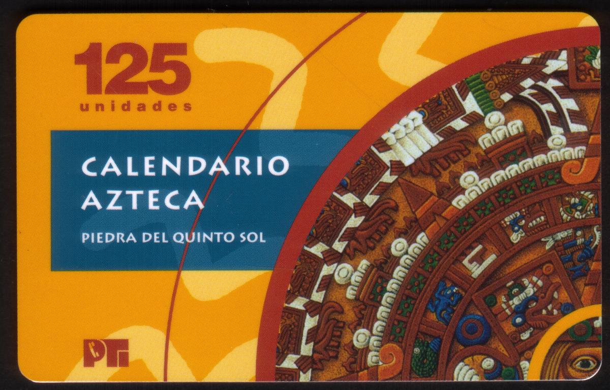 No other graphics or personal names are present on the front, and the card’s composition centers solely on the Aztec calendar imagery and associated text. The overall design communicates a strong cultural link to Mexico’s indigenous Aztec civilization through its artistic and calendrical motifs.