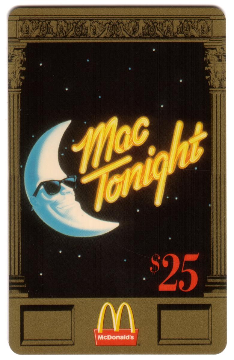 Overall, this card celebrates McDonald’s advertising iconography, combining nostalgic imagery of Mac Tonight with the brand’s Golden Arches symbol. The blue tones and stylized illustration highlight the connection to the nighttime theme of the original commercial, while the $25 value suggests it was issued with a prepaid or collectible function.