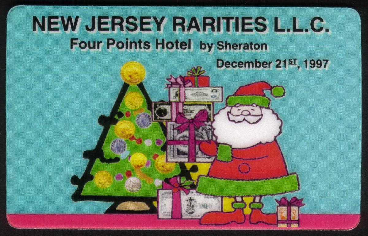 Limited-edition 1997 New Jersey Rarities Coin Show phone card featuring Santa, Christmas tree with coin motifs, and holiday-themed numismatic imagery. |