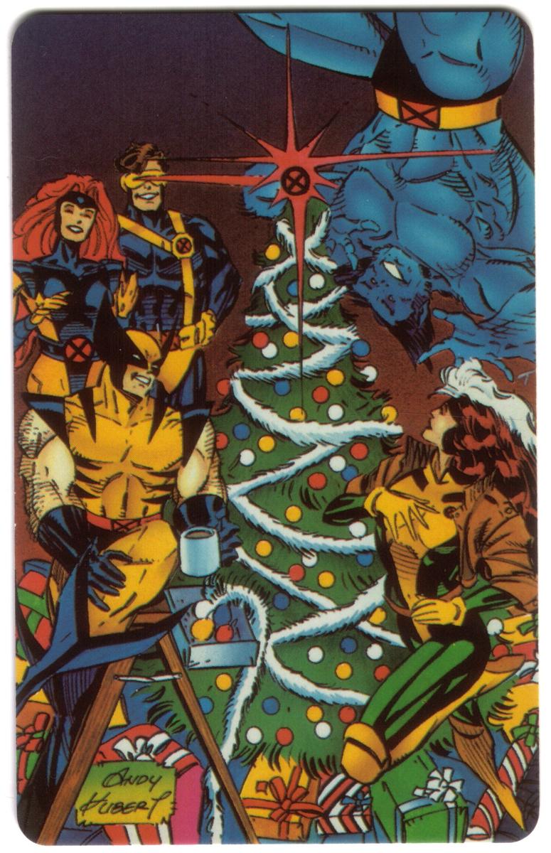 The characters are depicted in their classic comic book style with vibrant colors. Wolverine is in his yellow and blue costume, Cyclops wears his traditional blue and yellow outfit with the red visor, Nightcrawler is shown in his blue skin and red costume, Storm presents her white hair and black costume with a cape, and Colossus appears in his metallic form wearing red and yellow armor. The card celebrates both the X-Men and the Christmas season, combining Marvel’s superhero universe with holiday cheer.