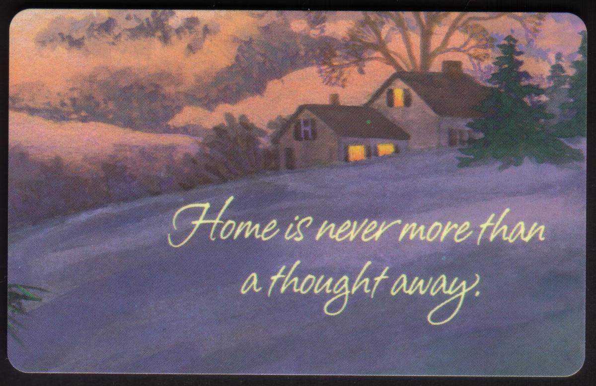 On the left side of the card, in elegant script, the phrase "Home is never more than a thought away" is printed. This sentiment adds a heartfelt and reflective tone to the imagery, reinforcing themes of home, warmth, and connection during the Christmas season. The overall composition uses calm, cool colors with touches of warm light to evoke feelings of comfort and nostalgia.