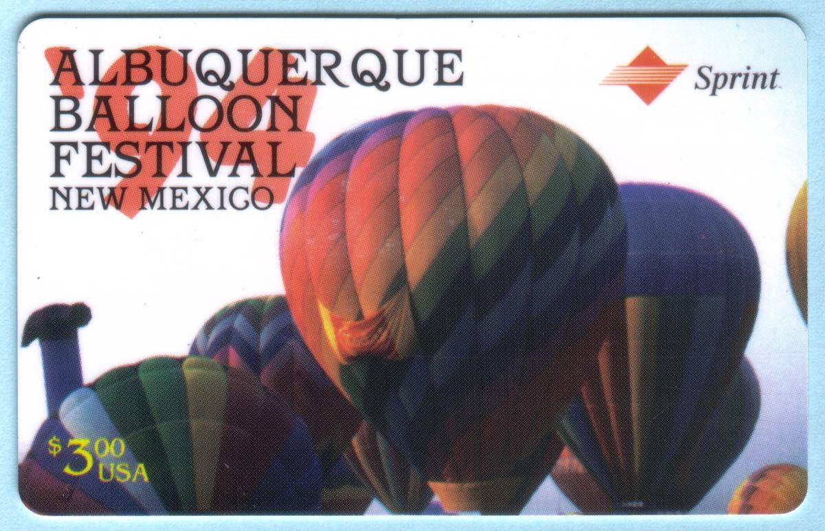 The collectible phone card features a vibrant scene from the Albuquerque Balloon Festival held in 1994 in Albuquerque, New Mexico. The image prominently displays multiple colorful hot air balloons ascending against a clear blue sky. The foreground shows the crowd gathered to witness the festival, with several balloons in various stages of inflation and takeoff. The balloons exhibit a variety of bright patterns and bold colors, enhancing the festive atmosphere of the event.