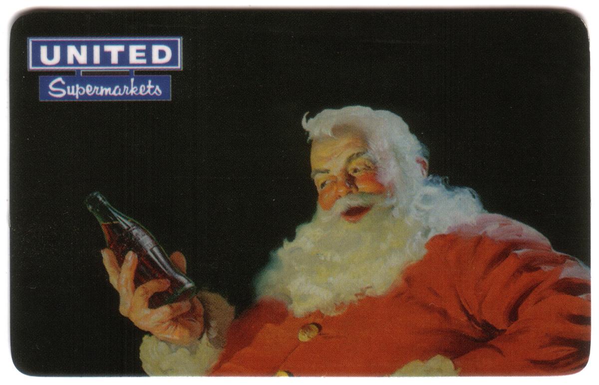 This collectible phone card features an image of Santa Claus, also known as St. Nick, holding a classic Coca-Cola bottle. Santa is depicted with his iconic white beard and red suit. The background highlights several Coca-Cola logos and Coke logos, emphasizing the brand’s advertising theme. There are also illustrations of polar bears, which are commonly associated with Coca-Cola holiday advertisements.