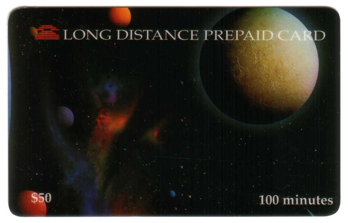 Overall, the card combines functional prepaid calling value with a space exploration aesthetic, making it a collectible item focused on the theme of planets and worlds beyond Earth within a galactic context. The design captures an imaginative view of outer space while providing practical use as a prepaid long distance calling card.