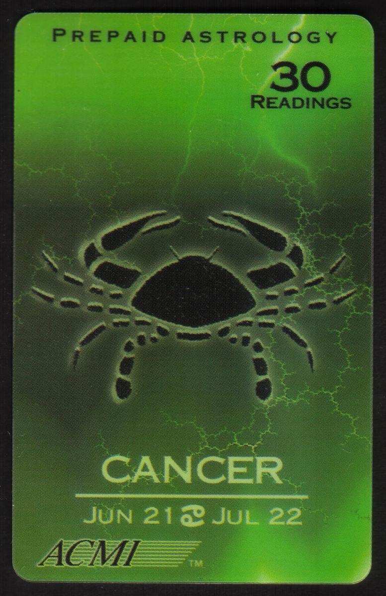 This collectible card features the astrological sign Cancer, represented by the crab symbol prominently displayed on the right side. The background features an artistic design incorporating the moon, emphasizing Cancer’s association with lunar influence. The card is part of the “Astrology Series: 30” and specifically focuses on the Cancer zodiac sign covering the dates from June 21 to July 22.