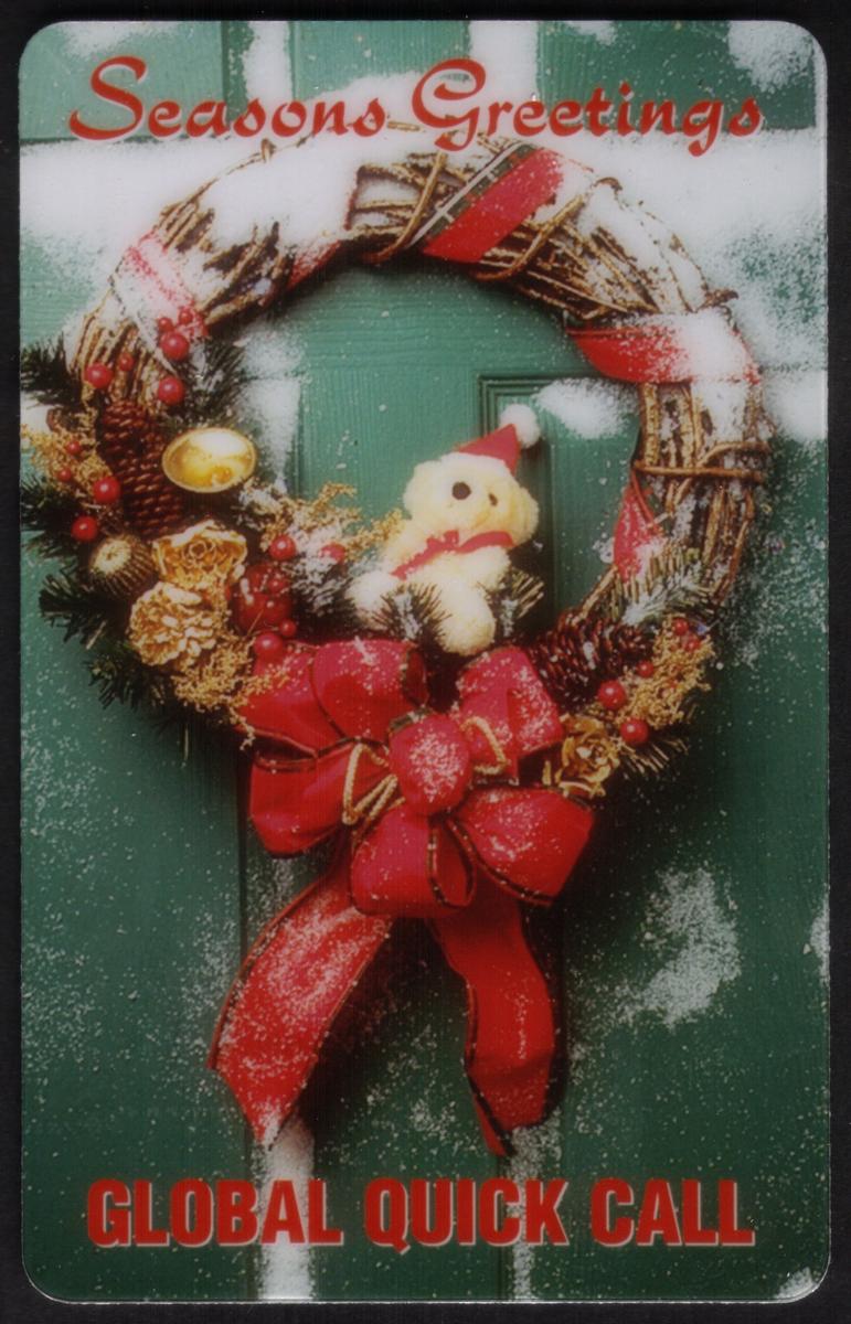 This collectible phone card features a festive holiday design centered around a Christmas wreath adorned with red bow accents and pinecones. The wreath is richly decorated, showcasing the holiday spirit with traditional elements that evoke the Christmas season. Positioned alongside the wreath is a teddy bear, adding a warm and cheerful touch to the overall imagery.