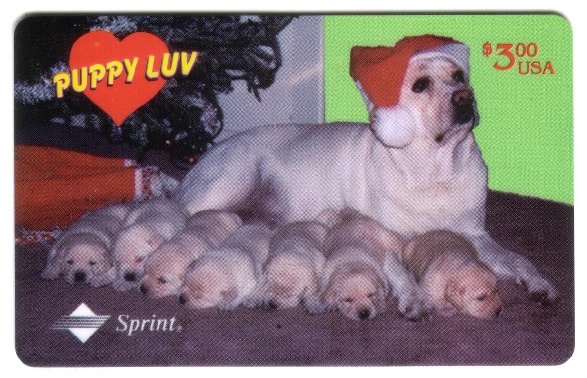 The card is associated with Sprint and is titled "Puppy Luv." The festive mood is reinforced by the Santa hat, linking the image to the Christmas or Xmas holiday season. The dogs’ positioning and expressions reflect warmth and affection, emphasizing the theme of "puppy love." The overall design centers entirely on the animals without any other graphics or text beyond what identifies the card's theme and source.
