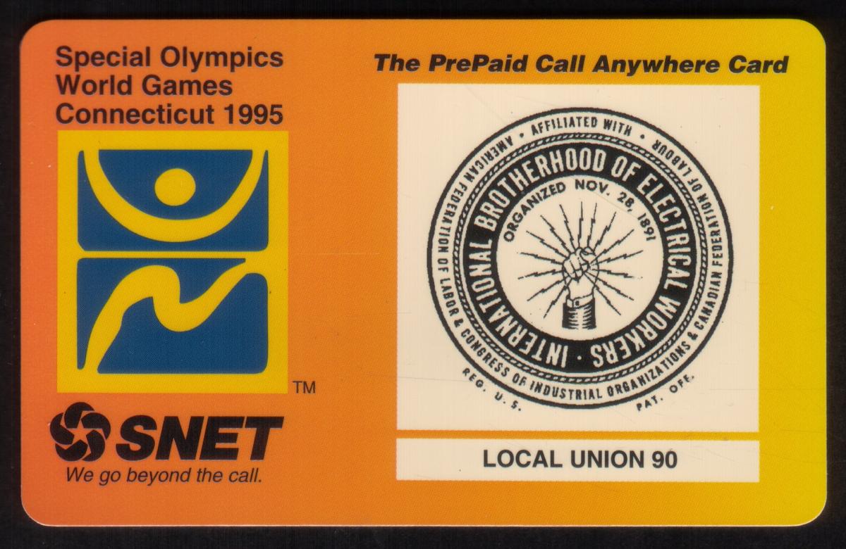 Overall, the card serves as a piece celebrating both the Special Olympics World Games and the collaboration of unions and sponsors committed to charitable causes and fundraising efforts. The presence of AFL-CIO, IBEW Local Union 90, and SNET logos confirms the card’s association with prominent organizations supporting this sports and social initiative.