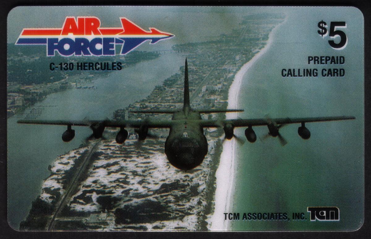 The card includes the text “Air Force III: C-130 Hercules” indicating its subject matter, and it is issued by TCM Associates, Inc. The denomination "$5" is clearly printed, marking its value. The overall design emphasizes fighter jets and military aircraft themes, consistent with the keywords “Military Aviation, jets, fighter jets, fighter planes, aeronautics, aircrafts, flying, jet airplanes, jet planes.”
