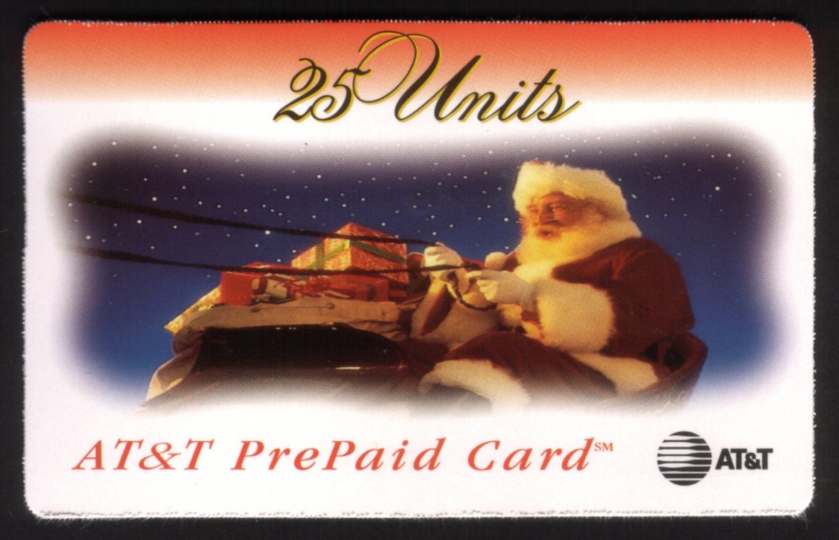 This collectible AT&T prepaid card from the 1995 holiday series features a festive Christmas-themed design. The central image shows Santa Claus dressed in his traditional red suit with white trim, holding the reins of a sleigh filled with colorful wrapped presents and toys. Santa’s sleigh is red with yellow runners, and the scene captures a lively holiday spirit. The background is a deep blue, providing strong contrast to Santa and his sleigh, enhancing the festive mood.