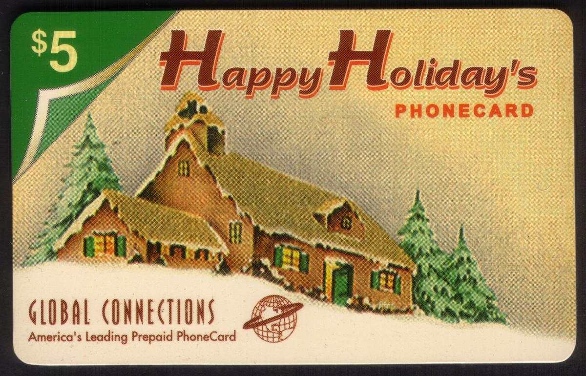 This collectible phone card features a festive winter scene with a focus on the holiday season. The main visual element includes snow-covered Christmas trees set against a winter landscape. The card displays a $5 value prominently. The text “Happy Holidays: Home In Winter (Global Connections)” is present, emphasizing a seasonal theme tied to global communications.