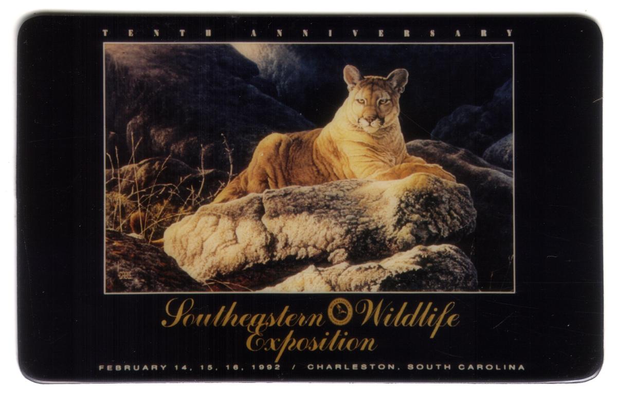 This collectible card features artwork by Lee Cable, who was named the 1992 Artist of the Year. The card highlights a mountain lion, a big cat native to the southeastern United States, depicted in a natural scene. The background setting corresponds to Charleston, South Carolina, linking the artwork to its geographic inspiration. The image captures the mountain lion with detailed attention to its form and presence within a scenic, wildlife-focused composition.
